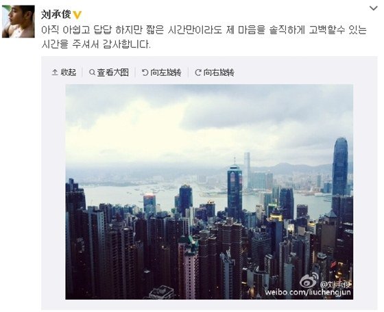 이미지 확대보기20일 유승준은 자신의 웨이보(SNS)를 통해 “아직 아쉽고 답답하지만 짧은 시간만이라도 제 마음을 솔직하게 고백할 수 있는 시간을 주셔서 감사합니다”는 글을 게재했다.