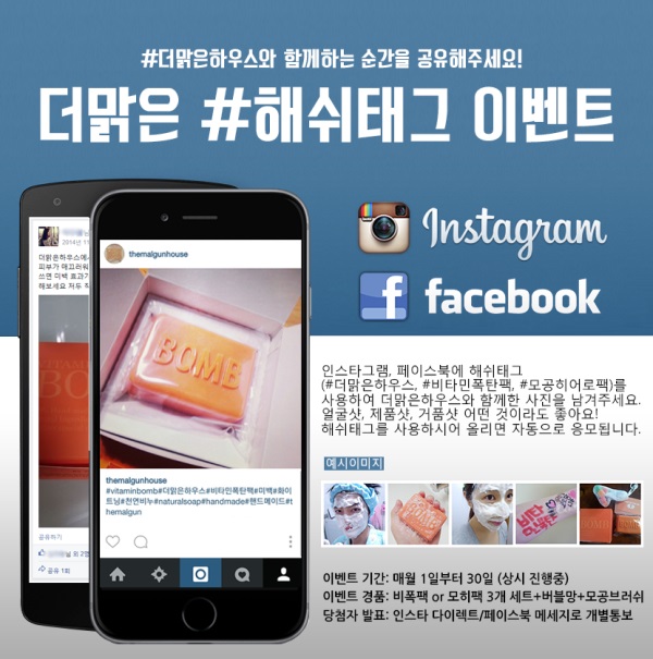 천연비누쇼핑몰 더맑은하우스는 홈페이지(www.themalgunhouse.com)에서 페이스북, 인스타그램을 통해 #해쉬태그 이벤트와 신제품 모공히어로팩 뷰티테스터 체험단을 모집 중이라고밝혔다.
