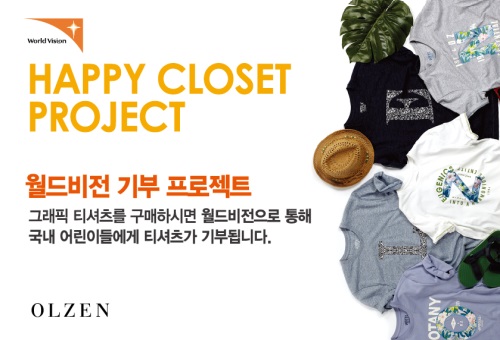 이미지 확대보기‘해피 클로젯 프로젝트’는 올젠과 월드비전이 2012년부터 진행한 기부 프로젝트이다. 올젠의 티셔츠 구매 시 월드비전을 통해 국내 소외된 계층의 어린이들에게 티셔츠가 기부된다.