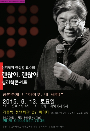 [글로벌이코노믹 노정용 기자] 나와는 상관이 없고 그저 어렵게만 느껴졌던 심리학이 한 중진학자의 노력으로 우리 생활 속으로 깊숙이 파고들고 있다. 글로벌이코노믹에 '심리학자 한성열의 힐링마음산책'을 연재중인 한성열 고려대 심리학과 교수가 '심리학의 생활화'를 목표로 강의실 밖으로 나와 일반인들에게 실질적 도움이 되는 심리학 콘서트를 열고 있는 것이다.한 교수는 매번 심리학 콘서트를 2회씩 200명 선착순으로 받고 있지만 그의 열강을 듣기 위해 몰려드는 청중들로 인해 강의실은 인산인해를 이루고 있다. 한성열 교수의 세 번째 '괜찮아 괜찮아' 심리학 콘서트는 오는 6월 13일 토요일 1시와 6시 두 차례 홍대입구역 부근에 있는 가톨릭청년회관에서 열린다.