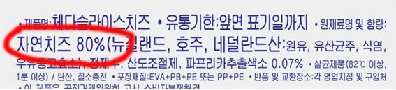 이미지 확대보기자연치즈 80%라고 표기된 가공치즈. 나머지 20%는 대체로 식용유 등과 함께 첨가물들이 들어간다.