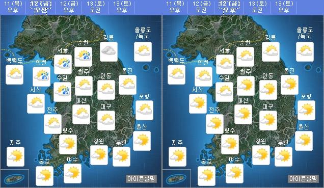 11일 기상청은 12일 내일 날씨를 기압골의 영향을 받다가 점차 벗어나 동해상에 위치한 고기압의 가장자리에 들겠다고 내다봤다.