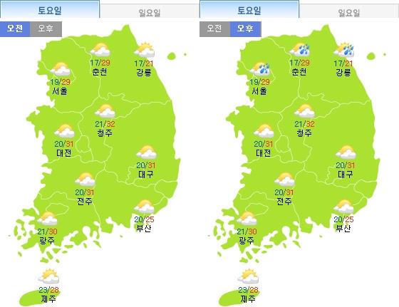 전국이 가끔 구름많겠고, 중부지방과 일부 남부내륙에는 대기불안정으로 오후부터 밤 사이에 소나기(강수확률 60~70%)가 오는 곳이 있겠다. 소나기가 내리는 지역에는 돌풍과 함께 천둥·번개가 치는 곳도 있어 기상청은 시설물 관리와 안전사고에 유의를 당부했다.