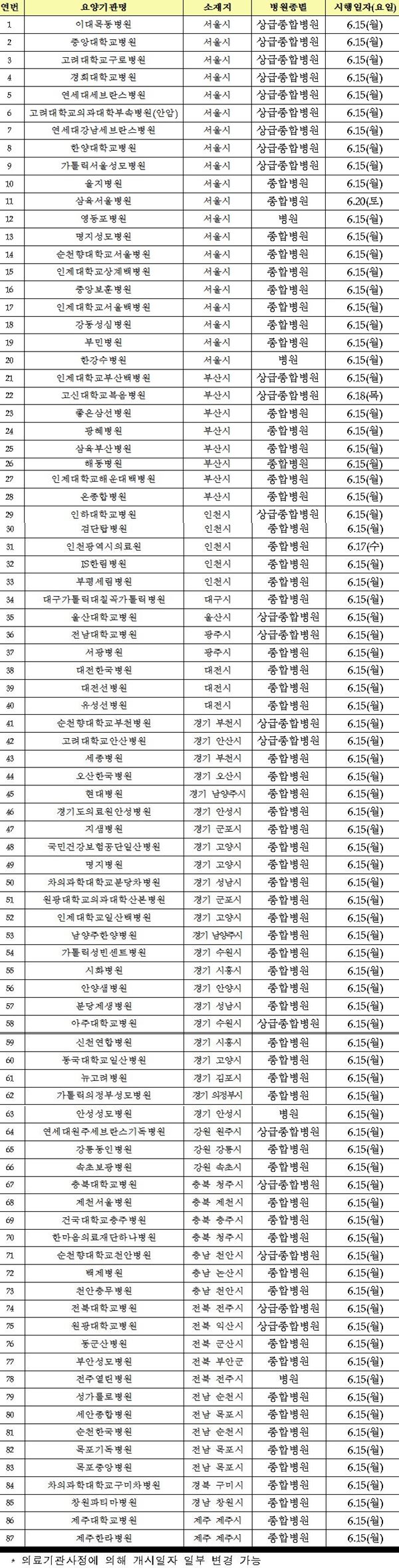 복지부는 "서울 연세대세브란스병원 등 상급종합병원 22곳과 순천향대서울병원 등 종합병원 및 병원급 의료기관 65곳이 신청했다. 이들 병원은 준비를 거친 뒤 15일부터 순차적으로 운영에 들어갈 예정이다"고 밝혔다.