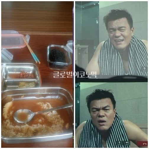 공개된 사진은 박진영의 점심 식사 현장. 국에 만 밥, 배추김치와 계란말이, 김 등 저칼로리로 이루어진 소박한 차림새가 눈길을 끈다.