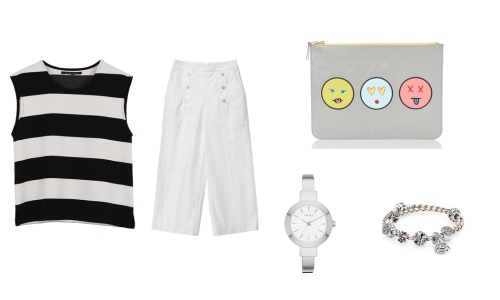 이미지 확대보기여기에 여름을 대표하는 아이템인 스트라이프 패턴의 슬리브리스 톱으로 경쾌한 느낌을 주며, 미니멀한 스타일의 실버 액세서리로 세련되면서도 엣지있는 스타일링 연출한다. 마지막으로 좀 더 포인트를 주고 싶다면 키치한 프린트가 들어간 클러치를 매치해 위트 있는 룩을 완성할 수 있다.