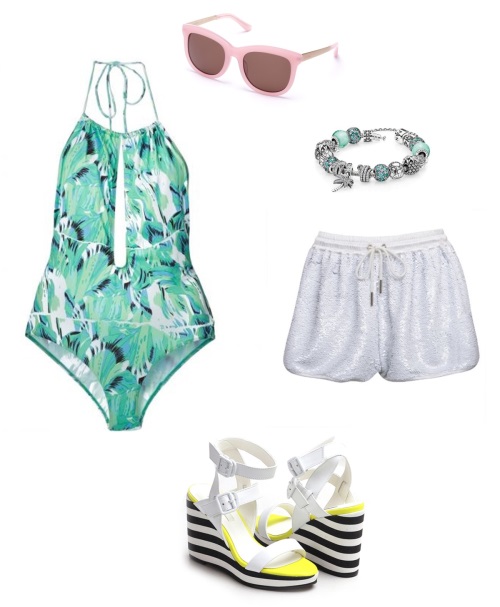 또 수영장 밖이나 해변에서의 휴식 시간을 즐길 때에는 어떤 그래픽 무늬와도 쉽게 매치가 가능한 화이트 숏팬츠를 선택하는 것이 좋다. 브랜드 이진은 화이트컬러의 스팽글로 장식된 숏팬츠를 출시해 스타일리쉬한 연출이 가능하다.