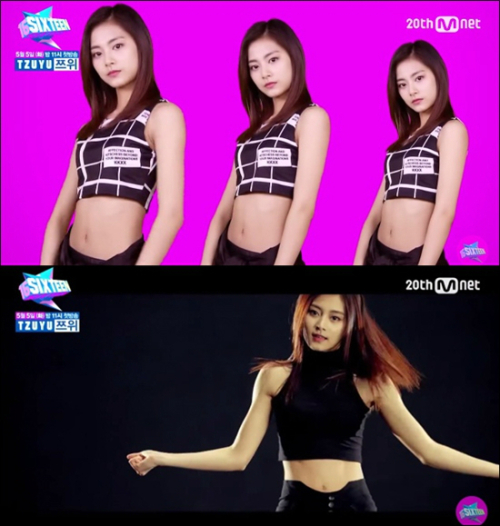 식스틴 쯔위는 식스틴 방영 전 공개된 개인 영상에서 허리라인이 드러나는 탑을 입고 등장해 환상적인 바디라인을 선보였다.