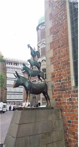 독일 북부의 도시 브레멘에 가면 거리 여기저기에서 금세 음악소리가 들릴 듯 브레멘 음악대를 상징하는 조형물이 많이 있습니다. ‘브레멘 음악대’는 그림형제가 쓴 전래동화로 당나귀, 개, 고양이, 닭 등 집에서 기르는 동물들이 등장합니다. 평생 동안 주인을 위해 성실하게 일한 당나귀는 늙어서 일을 못한다는 이유로 주인이 내다 팔려고 하자 브레멘으로 가서 유랑 악사가 되기로 합니다. 길을 가던 중 당나귀는 자신과 비슷한 처지에 놓인 개와 고양이, 그리고 닭을 만나 함께 길을 떠나는데 도둑들이 살고 있는 집에 당도하게 되자 소리 높여 합창을 하여 도둑을 쫓아내고 행복하게 산다는 이야기입니다.