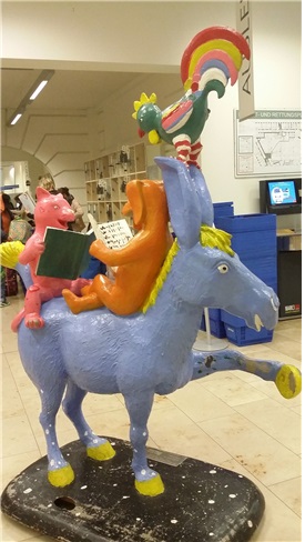 이미지 확대보기브레멘 시립도서관 현관에 설치된 브레멘 음악대 동상. 장소가 도서관이니만큼 동물들은 합창 대신 책을 열심히 읽고 있다