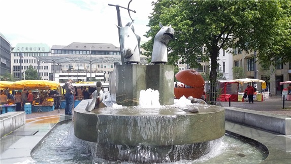 이미지 확대보기노천시장 입구에 설치된 분수대, 브레멘 음악대에 등장하는 동물들의 모습을 이용하여 시원한 물줄기를 뿜어내고 있다