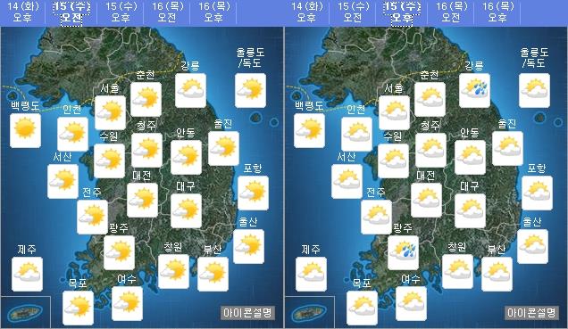 14일 기상청은 15일 내일 날씨를 동해상에 위치한 고기압의 가장자리에 들겠다고 내다봤다.