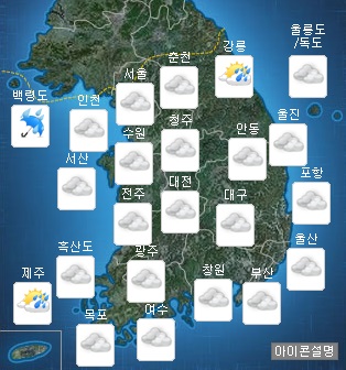 전국이 흐리고 제주도와 남부지방에 내리는 비(강수확률 60%)는 낮에 충청이남지방, 늦은 오후에는 전국 대부분 지방으로 확대되어 가끔 비(강수확률 0~80%)가 오는 곳이 있겠다.