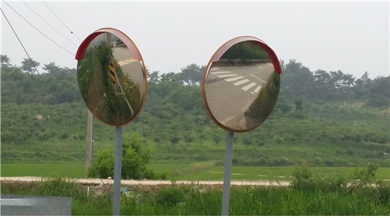 이런 아름다운 추억도 잠시, 역시 교사의 눈으로 다가온 것은 ‘안전’, 바로 ‘안전’이다. 자전거 주차장을 지척에 둔 정문에는 차량이나 사람, 사물의 움직임을 미리 감지할 수 있는 ‘안전 거울’ 두 개가 설치되어 있다.