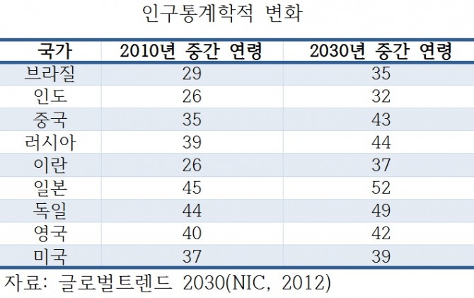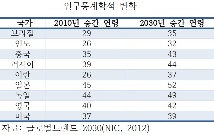 2050년까지 43개 이상의 국가들은 인구 감소를 겪는다. 65세 이상 인구가 15세 미만 어린이보다 많아지게 되는 2050년에는 은퇴 문제가 새롭게 정의되어야 할 것이다. 현재 미국, 유럽 등에서 연구되고 있는 인간-두뇌프로젝트들은 고령 인구가 더 젊고 건강하게 오래 사는 방법을 개발하고 있다. 미래에는 더 오래 일하고 다양한 형태의 스마트 워킹 등으로 재택근무와 파트타임이 주를 이루게 되고, 일자리 공유시스템이 차세대 청년계층의 경제적 부담을 줄이거나 삶의 질을 유지하게 될 것이다.