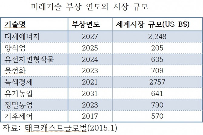 이처럼 인구 증가와 자원의 균형으로 지구촌의 지속가능한 미래를 만들어 가야 한다. 이를 위한 다양한 미래기술은 미래 성장 산업으로 크게 부상하게 될 것이다.