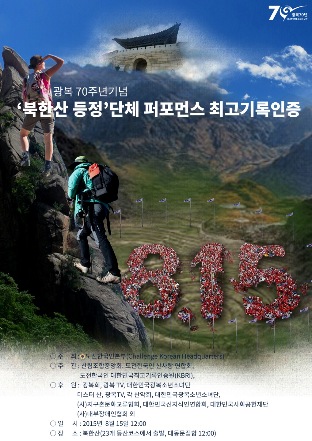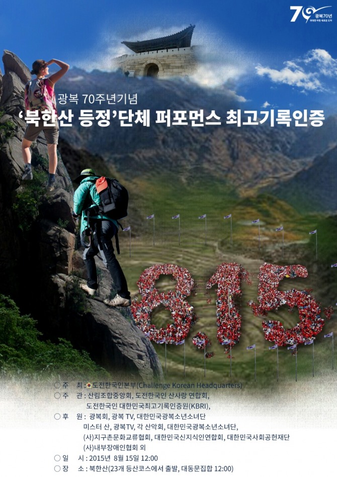 도전한국인본부가 주최하고 산림조합중앙회, 도전한국인 대한민국최고기록인증원(KBRI), 도전한국인 산사랑 연합회가 주관하는 이번 행사는 북한산의 23개 탐방로를 통해 모인 다양한 시민들이 하나로 뭉치고 함께 등산하며 8·15광복의 의미를 되새기는 뜻깊은 행사다.
