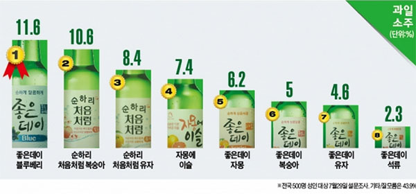이미지 확대보기4일 리얼미터는 전국 19세 이상 500명을 대상으로 설문조사한 결과 모두 8종의 과일소주 중 좋은데이 블루베리가 11.6%로 1위에 올랐다고 밝혔다.