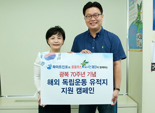 이미지 확대보기이번 캠페인은 7~8월 홈플러스 매장에서 고객이 하이트진로 상품(하이트 맥주·참이슬)을 구매할 때마다 판매금액의 3%를 적립했다. 해외소재 독립운동 유적지 및 광복 기념시설 지원을 위해 사용하는 방식으로 고객·협력회사·대형마트가 모두 동참해 광복 70주년의 역사적 의미를 되새기자는 취지로 마련됐다.