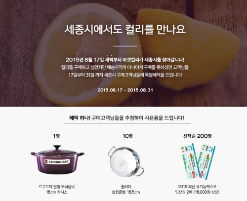 세종시 거주 구매고객을 위해 이벤트도 준비한다. 구매고객 중 추첨하여 르쿠르제 무쇠냄비, 트윙클볼을 증정하고 2015 괴산 유기농엑스포 입장권을 선착순 200명에 한해 배부한다. 구매 금액에 따라 최대 5000원 적립금도 지급한다. 이 이벤트는 8월 31일 21시까지 진행된다.