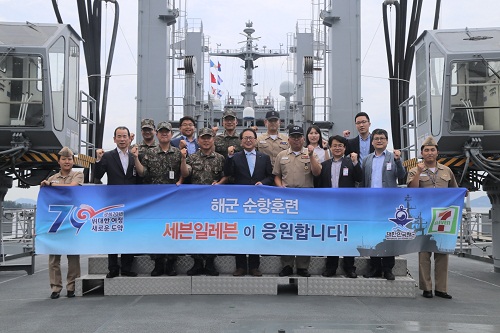 이미지 확대보기전달식에는 정승인 세븐일레븐 대표이사와 김종삼 해군순항훈련전단장(준장)이 참석했다. 후원물품은 생수, 과자, 라면 등으로 구성된 약 1200박스, 2만2000여개의 식료품 등으로 구성되었다.