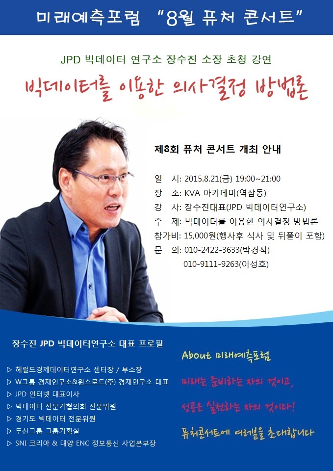 이번 퓨처 콘서트는 JPD 빅데이터연구소 장수진 대표를 초청, ‘빅데이터를 이용한 의사결정 방법론’을 주제로 최근의 이슈이자 미래산업인 빅데이터에 대한 깊이 있는 강의가 진행될 예정이다. 장수진 대표는 2년 전에 특허출원한 빅데이터를 이용한 경제지표가 최근 국내 최초로 특허 심사에 통과되었다.