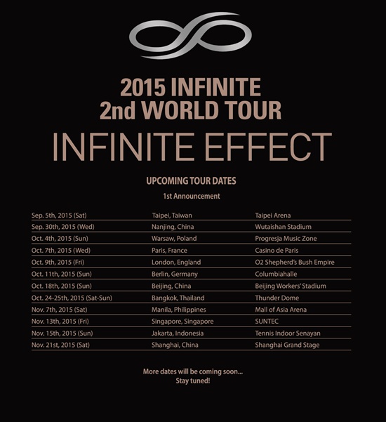 인피니트는 대만에 이어 9월 30일 중국 난징에서 공연을 가진 뒤 10월에는 4일부터 25일까지 각각 폴란드 바르샤바, 프랑스 파리, 영국 런던, 독일 베를린, 중국 베이징, 태국 방콕에서 3개월간 10개국을 돌며 총13회 월드투어 공연을 이어간다.