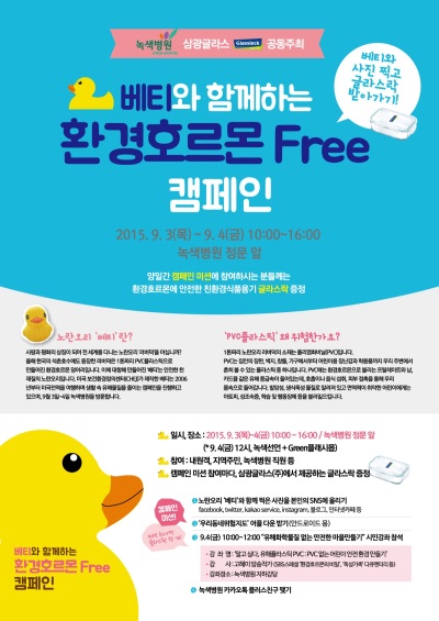 삼광글라스㈜는 지역 주민과 내원객 등을 대상으로 3일, 4일 양일간 녹색병원과 ‘베티와 함께하는 환경호르몬 프리 캠페인’을 공동 진행하고, 친환경 유리밀폐용기 글라스락(직사각 4호) 1600개(1000만원 상당)를 지원한다.