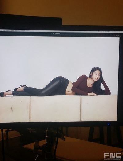 공개된 사진 속 설현은 광고 촬영 중으로, 바닥에 옆으로 누워 있는 모습이 담겨 있다.