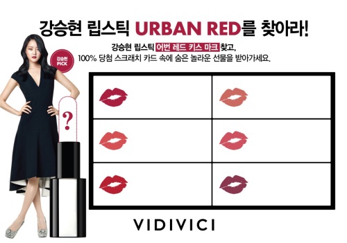 비디비치는 9월 11일부터 20일까지 총 열흘간 전국 비디비치 매장 내 비치돼 있는 이벤트 보드를 통해 강승현의 립스틱 색상 ‘어번 레드’를 찾는 모든 고객에게 100% 당첨 확률의 스크래치 카드를 증정한다.