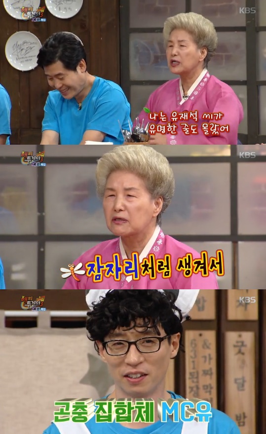 이에 유재석은 “그런 곤충류를 닮았다. 잠자리 사마귀 메뚜기 귀뚜라미”라고 밝혔고, 출연자들은 “여치” “방아깨비” 등을 덧붙여 좌중을 폭소케했다.