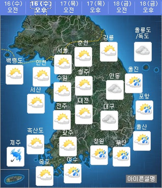 16일 기상청은 오늘 날씨를 동해상에 위치한 고기압의 가장자리에 들겠으나, 경상남북도와 제주도는 제주도남쪽해상을 지나는 기압골의 영향을 받겠다고 내다봤다.