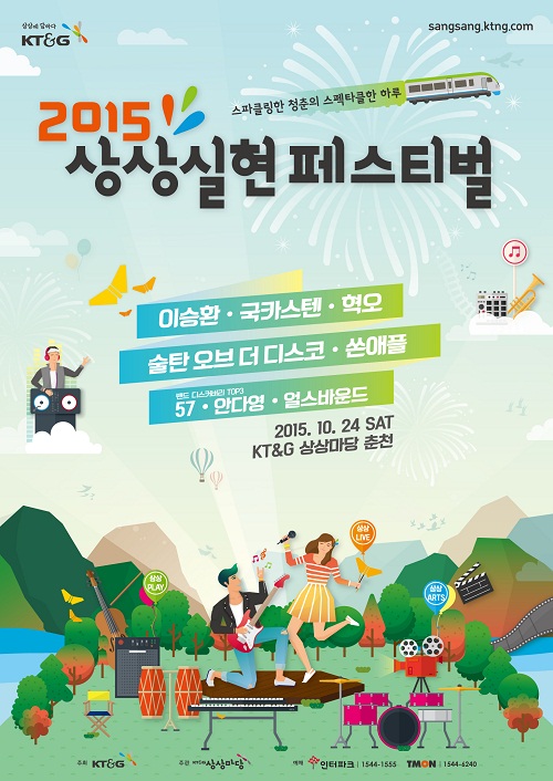 이미지 확대보기올해 처음 춘천으로 자리를 옮겨 열리는 '2015 상상실현 페스티벌'은 국내 최정상 뮤지션들이 선보이는 '상상 라이브(LIVE)'와 다양한 문화예술을 즐기고 체험하는 '상상 아츠(ARTS)', 페스티벌을 보다 풍성하게 하는 '상상 플레이(PLAY)'로 꾸며진다.