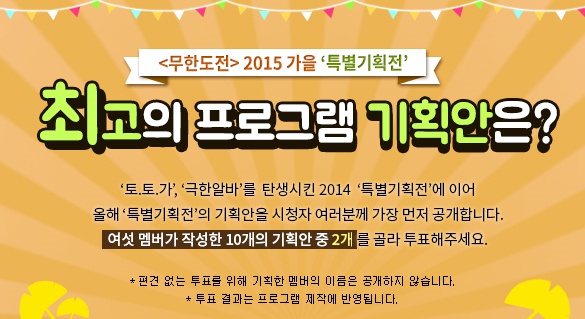 21일 MBC 예능프로그램 '무한도전' 측은 공식 홈페이지를 통해 2015년 가을 '특별기획전' 최고의 프로그램 기획안을 뽑는 투표를 실시했다.