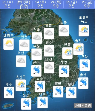 23일 기상청은 오늘 날씨를 서울.경기도와 강원도는 동해상에 위치한 고기압의 가장자리에 들겠고, 그 밖의 지방은 남해상을 지나는 저기압의 영향을 점차 받겠다고 전망했다.