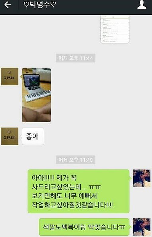 공개된 사진 속에는 박명수가 건반 사진과 함께 "좋아"라는 메세지를 보내고 있으며, 특히 유재환은 "아아! 제가 꼭 사드리고 싶었는데…보기만 해도 너무 예뻐서 작업하고 싶어질 것 같습니다. 색깔도 맥북이랑 딱 맞습니다"라고 답해 보는이들의 웃음을 자아냈다.