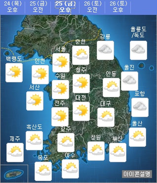 24일 기상청은 25일 내일 날씨를 동해북부해상에 위치한 고기압의 가장자리에 들겠다고 내다봤다.