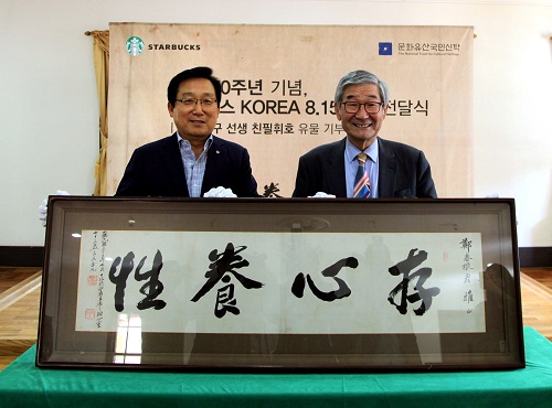 스타벅스가 광복 70주년 기금으로 기부하게 된 유물은 백범 김구 선생이 1948년에 쓰신 '存心養性(존심양성)' 친필휘호로 '좋은 마음을 그대로 지키고 간직하여, 하늘이 주신 성품을 키워 나간다'는 의미를 담고 있다. 백범 김구 선생의 '존심양성' 친필휘호 유물은 덕수궁 중명전에서 특별 전시될 예정이다.