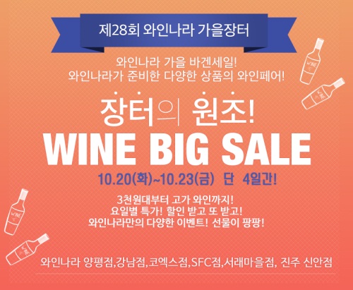 이미지 확대보기와인나라 장터는 지난 2002년도부터 봄과 가을 두 차례에 걸쳐 꾸준히 진행해 온 와인나라의 대표적인 정기 할인 행사다. 캐주얼 와인부터 아웃도어 와인, 프리미엄 와인 등 다양한 와인을 할인가로 제공한다.