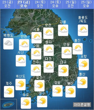23일 기상청은 오늘 날씨를 서해상에 위치한 고기압의 영향을 받겠으나 중부지방은 그 가장자리에 들겠다고 내다봤다.