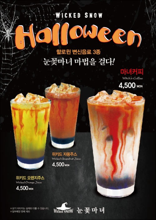 이미지 확대보기위키드스노우 핼러윈 신메뉴 3종은 '마녀 커피' '위키드 오렌지 주스' '위키드 자몽 주스' 등이다. 음료를 스트로우(마술봉)로 혼합하면 색이 변하는 특징이 있다.