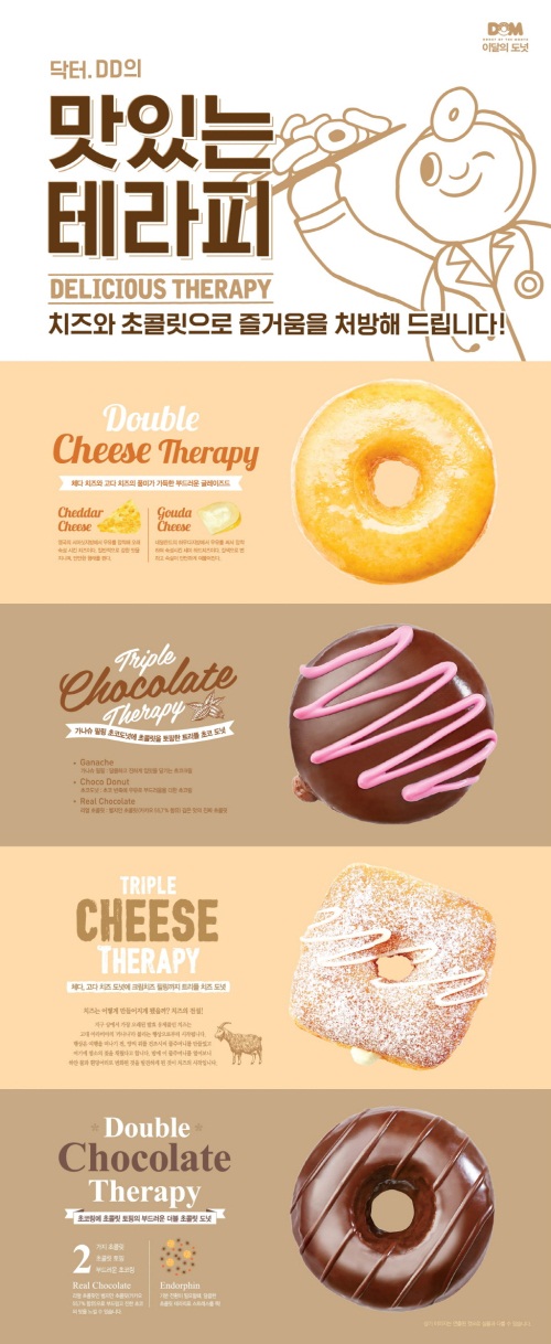 이미지 확대보기'닥터 DD의 맛있는 테라피' 도넛 4종은 부드러운 치즈와 달콤한 초콜릿으로 맛있는 즐거움을 선사한다는 콘셉트의 제품이다. 지친 일상 속 달콤한 힐링이 되어주는 제품으로 기분전환이 필요하거나 스트레스를 풀고 싶을 때 함께하기 좋은 도넛이다.