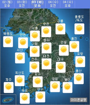 2일 기상청은 내일(3일) 날씨를 서해상에 위치한 고기압의 영향을 받겠다고 내다봤다.
