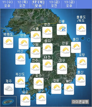 11일 기상청은 내일(12일) 날씨를 동해북부해상에 위치한 고기압의 가장자리에 들겠다고 전망했다.