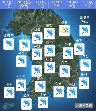 전국이 차차 흐려져 낮에 서해안과 제주도에서 비(강수확률 60~90%)가 시작돼 늦은 오후에는 전국에 비(강수확률 60~80%)가 오겠다.