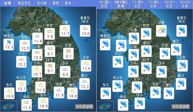 낮 최고기온은 12도에서 18도로 어제보다 낮겠다.