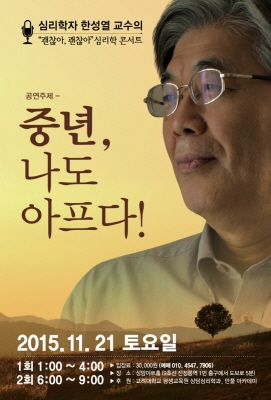 [글로벌이코노믹 노정용 기자] 심리학자 한성열 고려대 교수가 네 번째 심리학 콘서트 '괜찮아, 괜찮아'를 공연한다. 오는 21일 오후 1시와 오후 6시 두 차례에 걸쳐 지하철 9호선 선정릉역 근처에 위치한 성암아트홀에서 '중년, 나도 아프다!'를 주제로 제2의 사춘기로 불리는 중년 세대를 위로한다.한 교수는 그동안 '화와 친구되기' '우리가 남이가?' '아이구, 내 새끼!'를 주제로 심리학 콘서트를 진행해 큰 반향을 불러일으켰다. 특히 고민과 갈등을 풀기보다 안으로 삭이는 한국인의 문화특성을 이해한 다음에 들려주는 그의 심리학 콘서트는 많은 청중들의 공감대를 형성하고 있다.