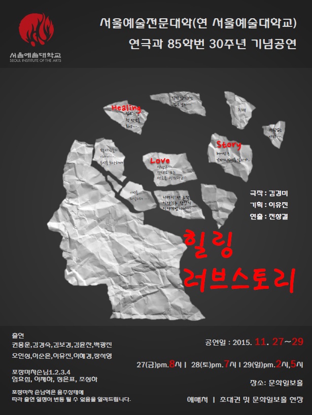 [글로벌이코노믹 강현수 기자] 찬바람이 부는 가을, 마음이 훈훈해지는 연극 하나가 공연된다. 2015년 11월 27일부터29일 3일간, 서울 중구 문화일보홀에서 공연되는 서울예술대학교(구 서울예전)연극과 85학번 동기들의 입학30주년 기념공연 “힐링러브스토리”가 그 작품이다. 본 기념공연 “힐링러브스토리”의 기획자 이유진 씨는 공연을 올리게 된 배경이 올해 초 서울예전 연극과 85학번 동기였던 KBS 공채 성우 고 김관진의 장례식장에서 동기들이 모여 다시 연극을 해보자는 마음들이 의기투합되어 30년이 지난 지금 예술직종사자, 연예인, 성우, 회사원, 사업가, 주부, 등 다양한 직업 가진 친구들이지만 입학시절 연극에 대한 뜨거운 열정을 부활시키려고 서로를 도와가며 열심히 준비하고 있다고 했다.
