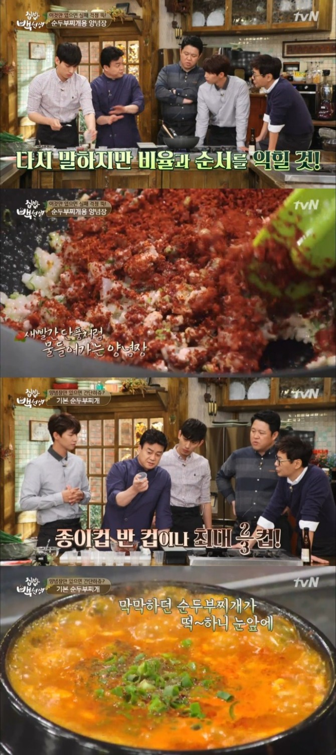17일 방송된 tvN 예능프로그램 '집밥 백선생'에서는 요리연구가 백종원이 4인의 제자 김구라, 윤상, 윤박, 송재림과 함께 순두부찌개를 손쉽게 만들 수 있는 레시피를 소개했다.