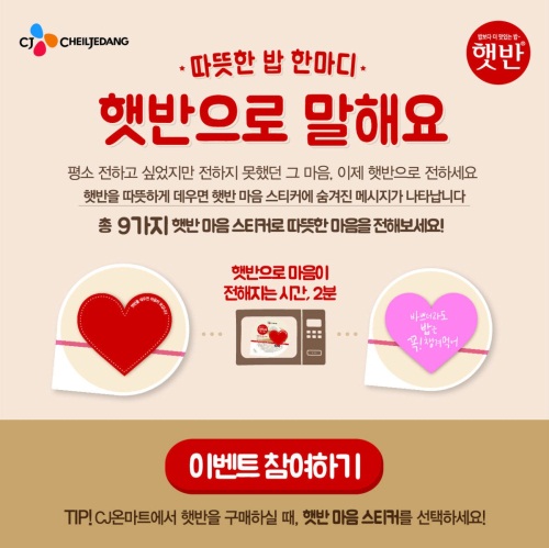 최동재 CJ제일제당 햇반팀 팀장은 "이번 행사를 통해 소비자가 가족과 친구를 비롯해 소중한 사람에게 '따뜻한 밥 한마디'를 전할 수 있을 것으로 기대한다"고 말했다.